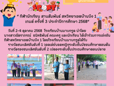 โรงเรียนบ้านมาบกรูด นำโดย นางสาวฉัตราภรณ์ ธนิทธิพันธ์ ผู้อำนวยการโรงเรียนบ้านมาบกรูด พร้อมด้วยคณะครู นักเรียนโรงเรียนบ้านมาบกรูดเข้าร่วมการแข่งขันกีฬานักเรียน สานสัมพันธ์ บึง 1 เกมส์ สหวิทยาเขตบ้านบึง 1 ในวันที่ 13-15 กันยายน 2566 ณ สนามกีฬาเฉลิมพระเกียรติ 80 พรรษา เทศบาลเมืองบ้านบึง โดยได้รับเกียรติจาก ดร.ธัญญารัตน์ บัวพันธ์ รองผู้อำนวยการสำนักงานเขตพื้นที่การศึกษาประถมศึกษาชลบุรี เขต 1 เป็นประธานในพิธี ในการแข่งขันกีฬาประกอบด้วย ฟุตบอล วอลเลย์บอล แชร์บอล เปตอง ตะกร้อ และกรีฑา เพื่อให้นักเรียนมีความรักใคร่สามัคคีกัน และรู้จักใช้เวลาว่างให้เป็นประโยชน์โดยการเล่นกีฬา