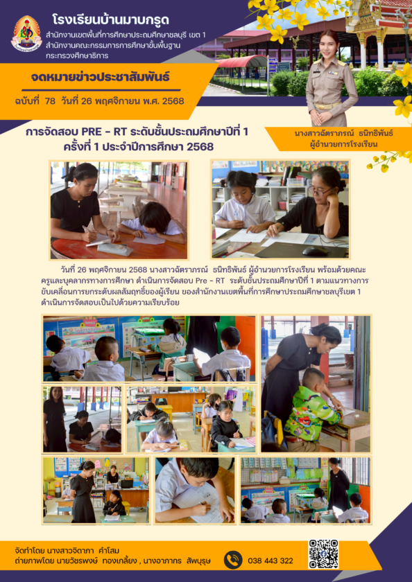 วันที่ 26 พฤศจิกายน 2568 นางสาวฉัตราภรณ์ ธนิทธิพันธ์ ผู้อำนวยการโรงเรียน พร้อมด้วยคณะครูและบุคลากรทางการศึกษา ดำเนินการจัดสอบ Pre – RT ระดับชั้นประถมศึกษาปีที่ 1 ตามแนวทางการขับเคลื่อนการยกระดับผลสัมฤทธิ์ของผู้เรียน ของสำนักงานเขตพื้นที่การศึกษาประถมศึกษาชลบุรีเขต 1 ดำเนินการจัดสอบเป็นไปด้วยความเรียบร้อย