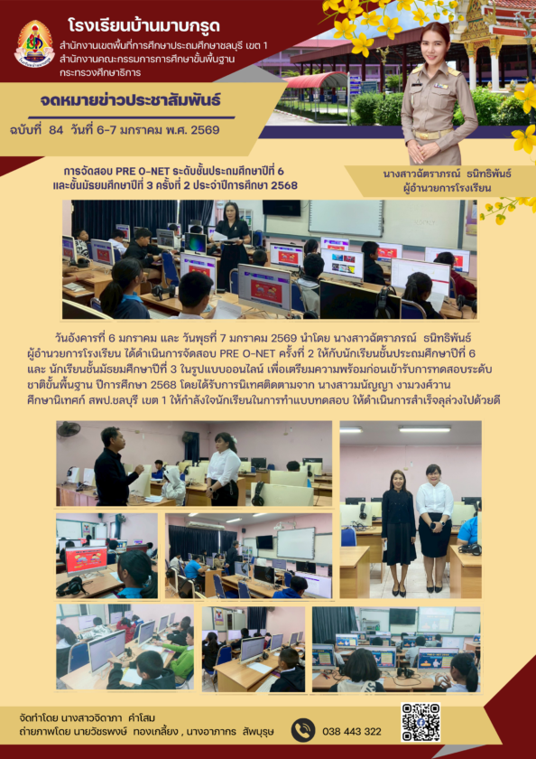 วันอังคารที่ 6 มกราคม และ วันพุธที่ 7 มกราคม 2569 นำโดย นางสาวฉัตราภรณ์ ธนิทธิพันธ์ ผู้อำนวยการโรงเรียน ได้ดำเนินการจัดสอบ PRE O-NET ครั้งที่ 2 ให้กับนักเรียนชั้นประถมศึกษาปีที่ 6 และ นักเรียนชั้นมัธยมศึกษาปีที่ 3 ในรูปแบบออนไลน์ เพื่อเตรียมความพร้อมก่อนเข้ารับการทดสอบระดับชาติขั้นพื้นฐาน ปีการศึกษา 2568 โดยได้รับการนิเทศติดตามจาก นางสาวมนัญญา งามวงศ์วาน ศึกษานิเทศก์ สพป.ชลบุรี เขต 1 ให้กำลังใจนักเรียนในการทำแบบทดสอบ ให้ดำเนินการสำเร็จลุล่วงไปด้วยดี