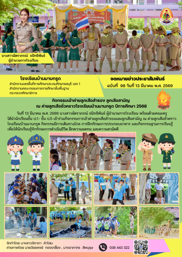 วันที่ 13 มีนาคม พ.ศ. 2569 นางสาวฉัตราภรณ์ ธนิทธิพันธ์ ผู้อำนวยการโรงเรียน พร้อมด้วยคณะครู ได้นำนักเรียนชั้น ป.1- ชั้น ป.5 เข้าร่วมกิจกรรมการเข้าค่ายลูกเสือสำรองและลูกเสือสามัญ ณ ค่ายลูกเสือชั่วคราวโรงเรียนบ้านมาบกรูด กิจกรรมมีการเดินทางไกล การฝึกทักษะการประกอบอาหาร และกิจกรรมฐานการเรียนรู้ เพื่อให้นักเรียนรู้จักทักษะการดำเนินชีวิต ฝึกความอดทน และความสามัคคี